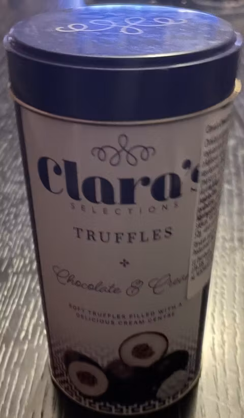 Choklad och gräddtryffel i plåtburk. Nettovikt 150 gram.